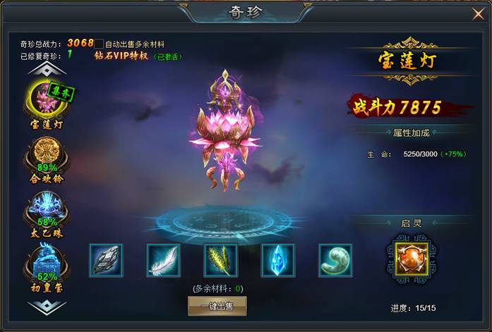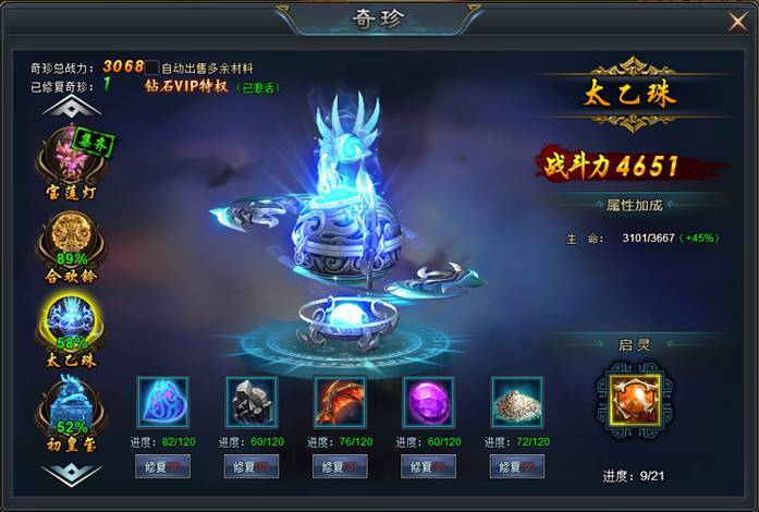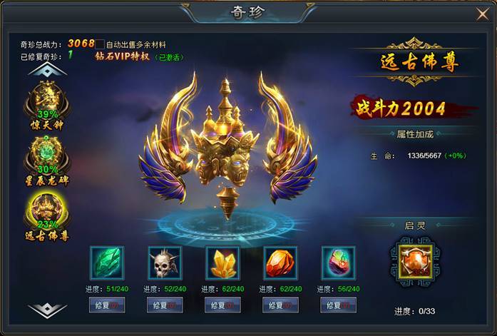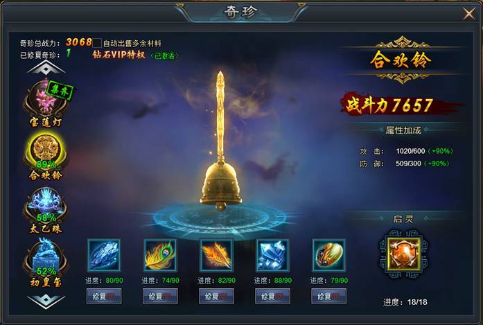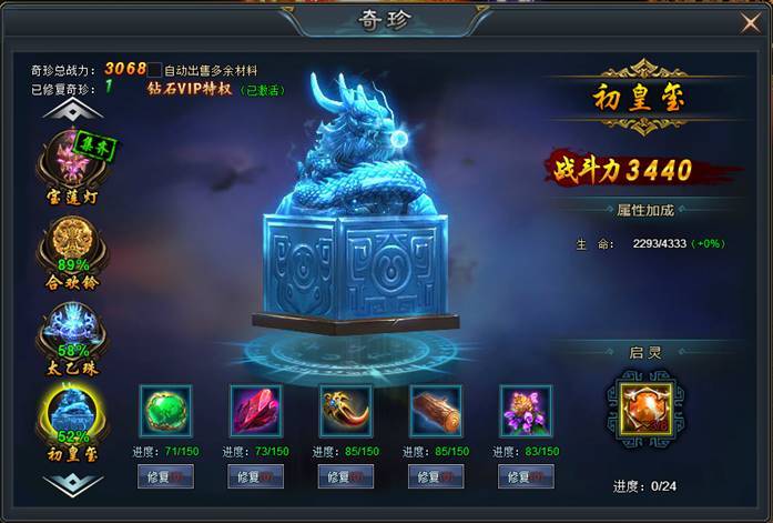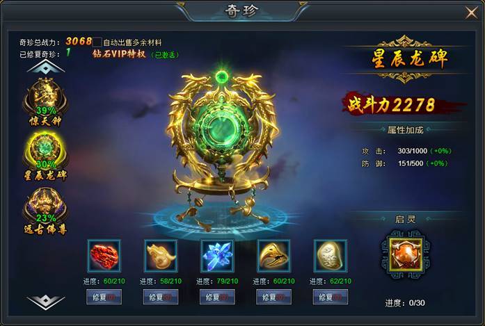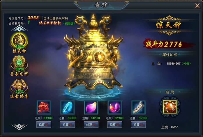 同时,对奇珍还可使用奇珍起灵石,每次启灵可获得奇珍全属性加成5%!奇珍启灵石可以通过开服冲榜活动获得。