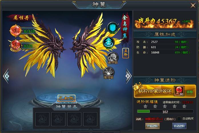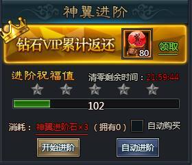 神翼的的升级材料可以通过神翼副本大量获得。激活钻石VIP,还可返还一定量进阶神翼所消耗的神羽。
