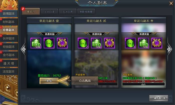 珍兽副本包括:羊驼、白泽、白虎、独角兽、角犀、金猊兽六个副本,每个副本又分为壹、贰、叁……共九个等级,每个副本每天可进入1次,首通之后可获得大量精血同时还可获得大量经验,挑战后消耗元宝可重置并扫荡,并返还绑定元宝,花多少,返多少!