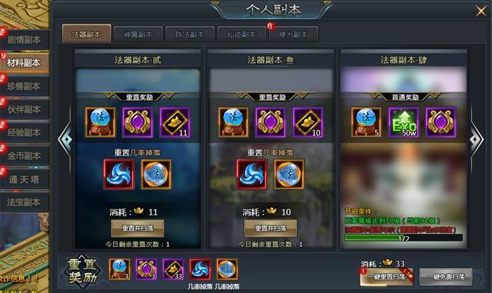 材料副本包括:法器、神翼、阵法、仙迹、神器、剑魂、炼气、修为副本,每个副本又分为壹、贰、叁……共九个等级,每天每个副本可进入1次。挑战后消耗元宝可重置并扫荡,并返还绑定元宝。由于难度系数的不同,开启件也跟玩家的等级有关。