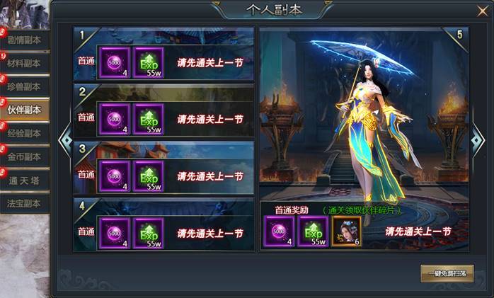 伙伴副本每一章分为五节,每通关一章即可获得一位伙伴作为奖励,每个副本每天可进入1次,首通之后可获得大量伙伴修为丹奖励,通过之后可以一键扫荡,直接获得奖励!