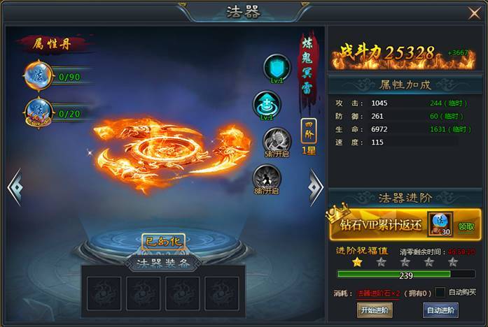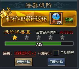 法器的的升级材料可以通过法器副本大量获得。激活钻石VIP,还可返还一定量进阶法器所消耗的晶石。